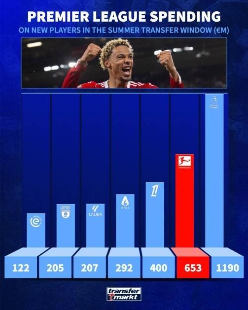 直播吧9月7日讯 《转会市场》统计了英超球队今夏引援所花费转会费的去向,英超内部消化11.9亿欧元,而他们从德甲引援的转会费支出高达6.53亿欧元。